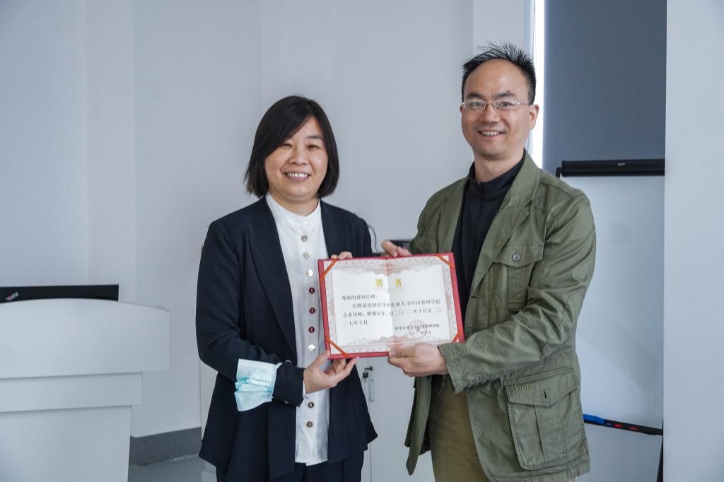 参观结束后,一行人回到培训教室,王勇代表学院为人力经理肖恒颁发企业导师证书。随后,也是本次旅程的重中之重,肖恒就同学们感兴趣的绩效管理方面的问题,结合采埃孚公司独有的绩效管理系统PPS(Performance(绩效)、Potential(潜能)和Succession(继任))进行了详细的讲解。谈及绩效评估标准,肖恒提到了5个关键词:激情、遇见,多元,赋权和责任。值得注意的是,采埃孚公司的绩效评估没有准确标准的数字计算,肖恒称其为“模糊化(rough)”的绩效考核。此外,肖恒还给同学们展示了采埃孚绩效管理的操作系统与工具表格,让大家进一步了解企业内部绩效考核的实施过程和技术。