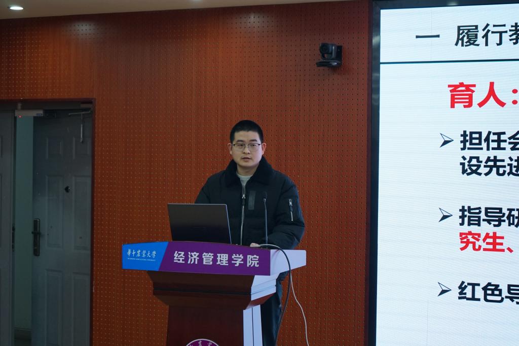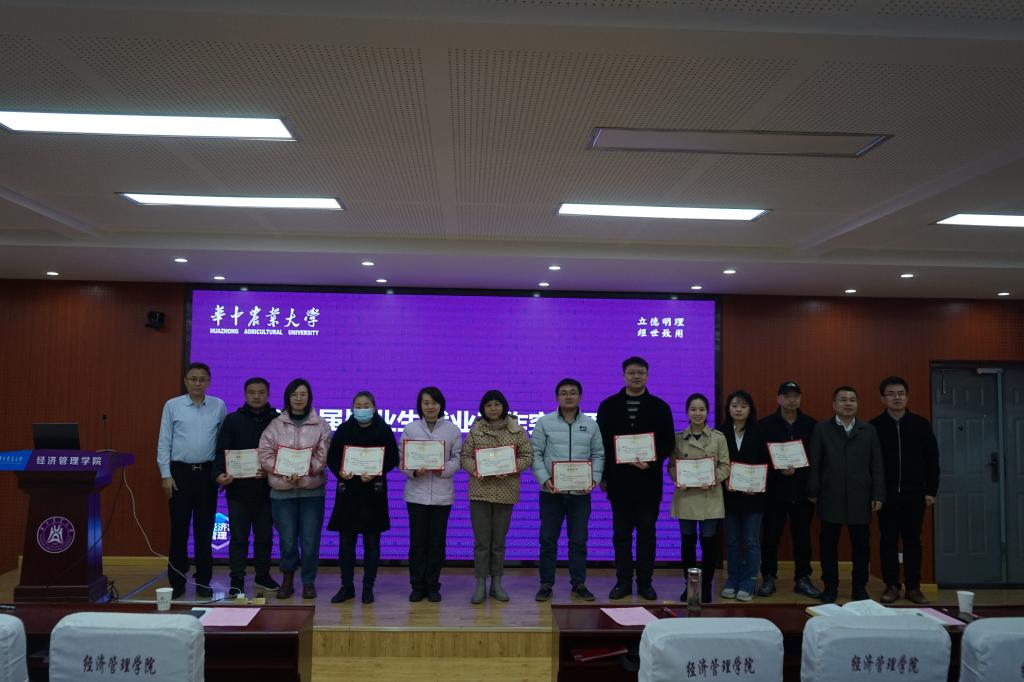 李谷成宣读了学院《关于授予李艳军教授“2022年度教书育人成就奖”、授予教师郑本荣、周晶、肖邦明“2022年度教书育人贡献奖”以及授予宋长鸣等11名教师“2022届毕业生就业工作突出奖”》表彰文件,学院党委书记陈国顺为获奖教师颁发了荣誉证书。