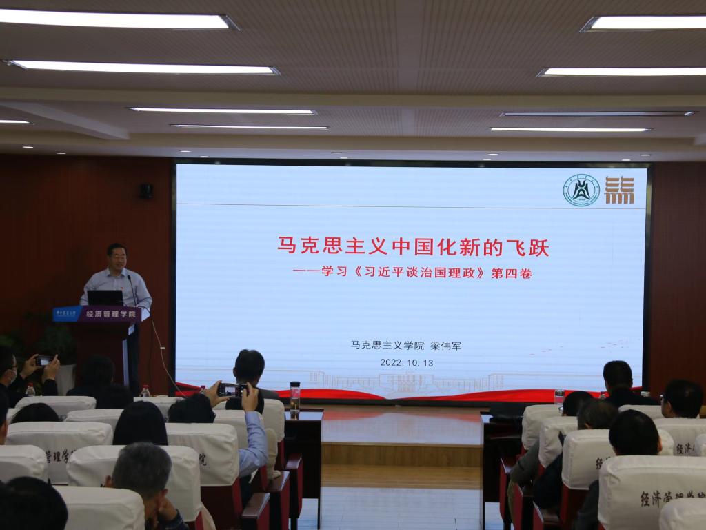 为了深入学习领会《习近平谈治国理政》第四卷,进一步加强思想理论武装,10月13日下午,永利官网马克思主义学院梁伟军教授应邀做了“马克思主义中国化新的飞跃——学习《习近平谈治国理政》第四卷”精读精讲专题辅导报告。全院教职工参会学习。报告会由院党委书记陈国顺主持。