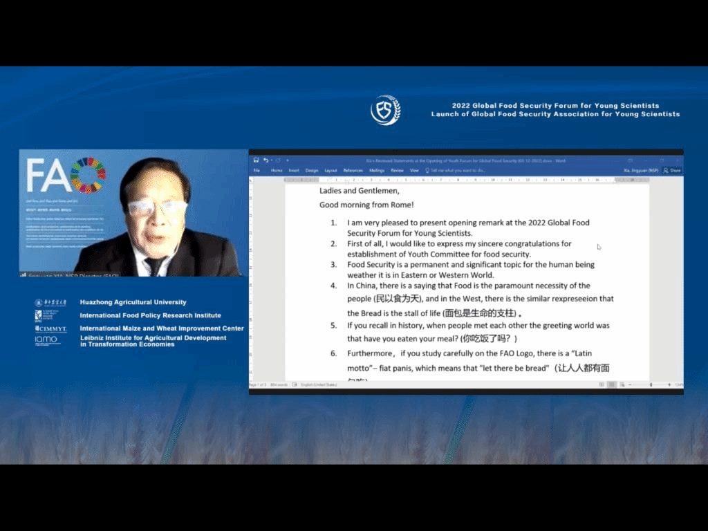 夏敬源教授在线致辞,他充分肯定了举办此次论坛对全球粮食安全问题治理的重要意义。他指出,当前全球在解决饥饿问题上面临诸多长期和短期的挑战。随着人口增长和膳食结构转型,对粮食的数量和质量需求的将持续提高,加之近年的极端天气频发、疫情全球流行,深入探索和推进可持续的农业发展方式刻不容缓。他认为,加强青年学者之间的合作交流是解决诸多现实问题的重要举措途,此次论坛的举办正式这一举措的有力实践。。他青年学者勇敢地肩负起全球粮食安全治理的时代使命,努力成为维护全球粮食安全的中流砥柱。