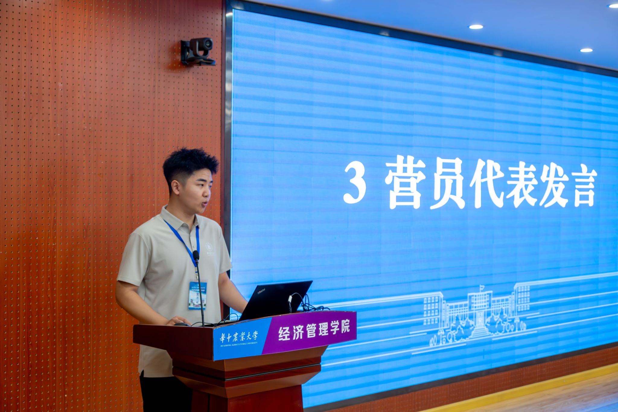 新疆农业大学的张浩同学作为营员代表进行发言。他从新疆农业大学和yl6809永利官网的学习经历出发,讲述了个人的成长故事。他深刻体悟到知行结合之难与用所学解决实际问题、服务农业的使命感。此外,他表达了对华农经管沃土的向往,并号召全体营员积极投入活动,明确方向,力争将来为乡村振兴贡献力量。