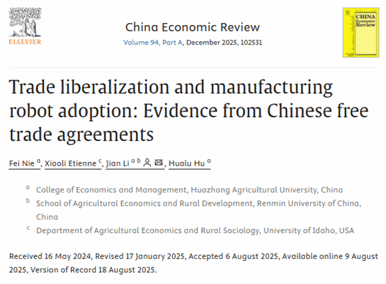 由永利官网聂飞副教授(第一作者)、李剑教授(通讯作者)、硕士研究生胡华璐与美国爱达荷大学 Xiaoli Etienne 合作撰写的学术论文“Trade liberalization and manufacturing robot adoption: Evidence from Chinese free trade agreements”近日发表于经济学权威期刊“China Economic Review”。“China Economic Review”(SSCI Q1,IF=5.5)是一本专注于中国经济研究的国际学术期刊,致力于发表有关中国经济发展、政策与市场等方面的高质量研究成果,在国际经济学界具有较高的学术声誉与广泛影响力。