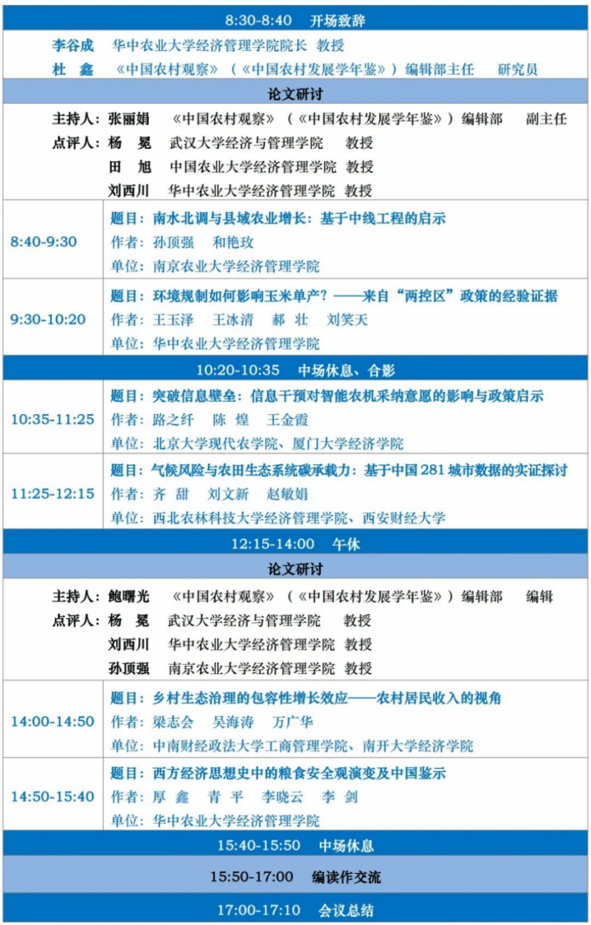 中国农村发展学Seminar是《中国农村观察》(《中国农村发展学年鉴》)编辑部为促进中国农村发展学领域的学术交流与研究创新,提升论文研究质量,发掘和培养优秀人才,与全国各高校及研究机构联合举办的小型学术论文研讨会议。每期中国农村发展学Seminar将邀请入选论文作者做现场报告,并邀请专家对论文进行现场点评。