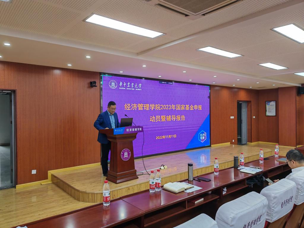 11月11日上午9:00,2023年度国家基金项目申报动员暨辅导报告会在人文楼M501会议室召开。会议以线上线下同步进行的方式开展,科发院人文社科处副处长王鹏,yl6809永利官网院长李谷成,学校人文社科相关学科100余位师生参加了会议。本次活动由学院副院长颜廷武主持。