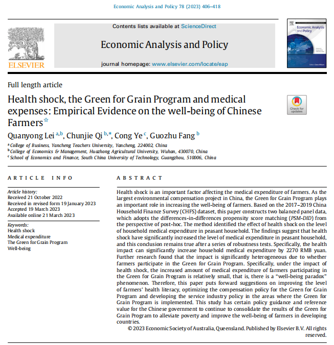 近日,永利官网yl6809永利官网祁春节教授、博士研究生雷权勇、方国柱以及华南理工大学叶聪博士以“Health shock, the Green for Grain Program and medical expenses: Empirical Evidence on the well-being of Chinese Farmers”为题在国际期刊Economic Analysis and Policy发表研究成果。该研究发现,健康冲击会显著地增加农户的医疗支出水平,但该效应因农户是否参与退耕还林项目而具有异质性。具体而言,在健康冲击下,参与退耕还林农户医疗支出的增加份额相对较少,即存在“幸福悖论”现象。