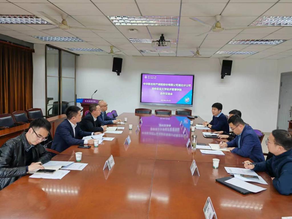 4月4日下午,中华联合财产保险股份有限公司湖北分公司总经理胡劲峰、总经理助理曾凡武,农村保险事业部总经理曹斌,农村保险事业部总经理助理苏晓强来学院开展合作交流事宜。学院副院长颜廷武教授、经济学系陶建平教授、农林经济管理系熊涛教授参加了会议。会议由学校人文社科处副处长、经济学系李剑教授主持。