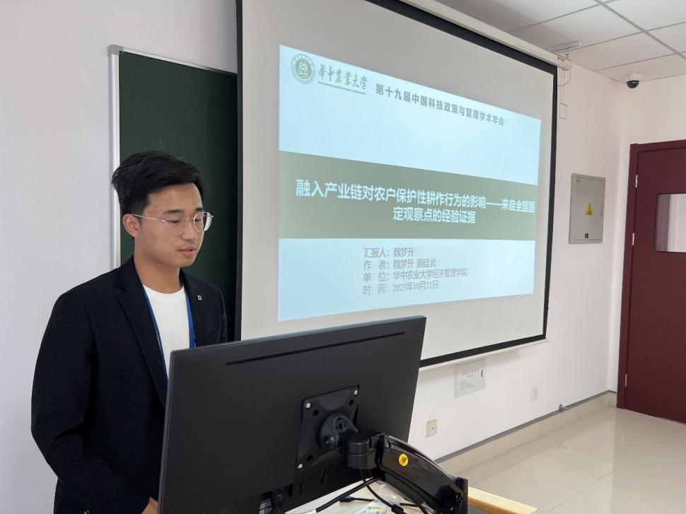 21日下午,2021级博士研究生魏梦升应邀在“分会场7:一体化战略背景下创新驱动高质量发展”进行了题为“融入产业链如何影响农户保护性耕作行为——来自全国固定观察点的微观证据”的汇报。该分会场主持人为华中科技大学管理学院房超教授,评议人为中国科学学与科技政策研究会融合创新专委会主任、清华大学周羽教授。