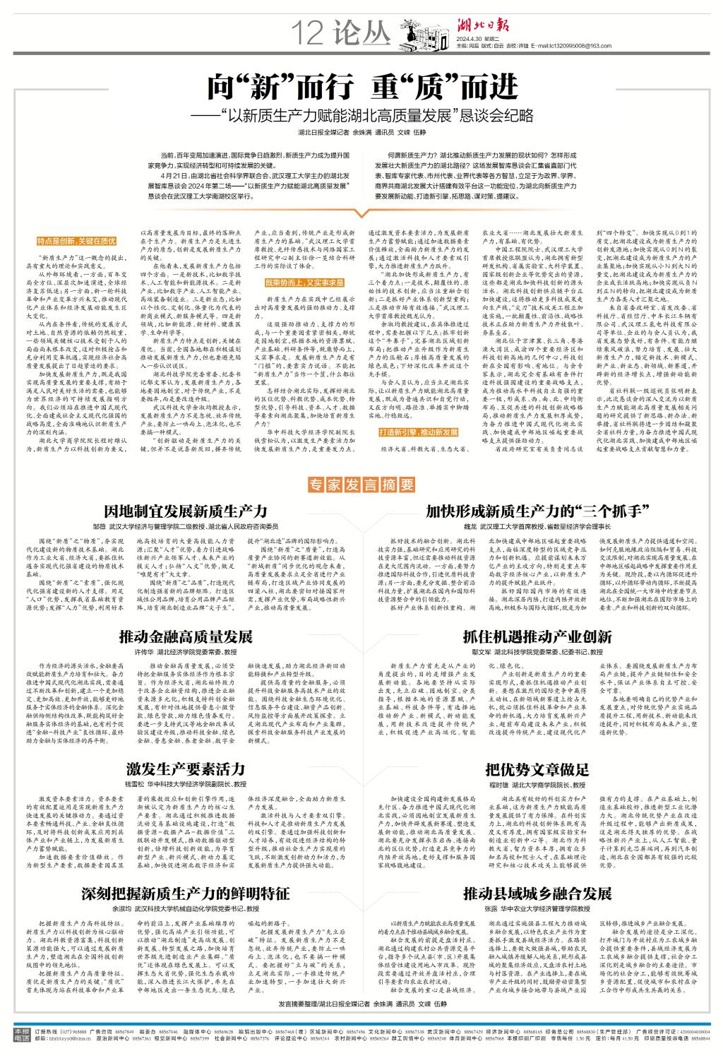 “湖北加快形成新质生产力,有三个着力点:一是技术,颠覆性的、原始性的技术创新,应当注重融合创新;二是抓好产业体系创新型重构;三是推动市场有效连接。”武汉理工大学首席教授魏龙认为。