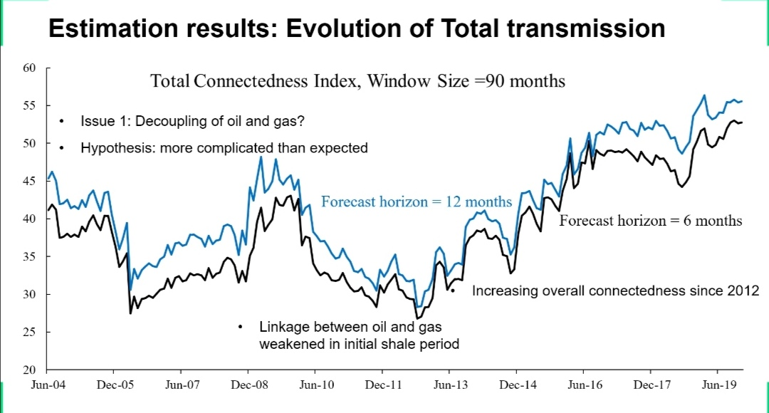 首先,针对油和天然气市场脱钩问题,文章提出如下假设:石油和天然气脱钩问题比预期更复杂。Etienne教授认为应从系统的角度评价石油和天然气市场关联,而不是简单地看二者的价格关系。研究发现,全系统视角上石油和天然气之间的信息传递增加,且资源竞争与联合生产的上升大于替代效应的下降。