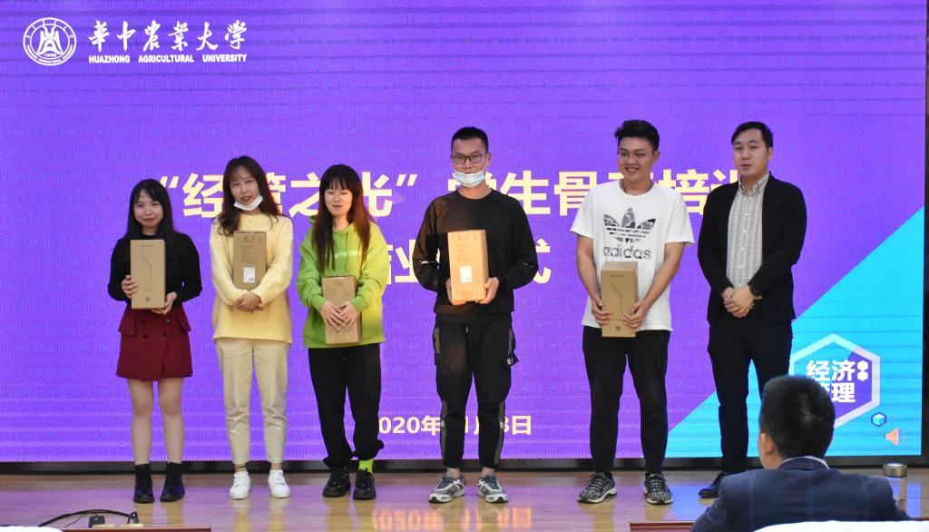 11月8日下午,“经管之光”培训活动结业仪式正式开始。水深占鳌头,月中折桂枝,此次培训按照积分制原则,参考学生骨干培训表现,授予程浩南、王紫毅、杨刘洋、张予欣、张露兮五位同学“2020年经管之光学生骨干培训班优秀学员”的荣誉,并由陈尉老师为其赠与纪念品。随后程浩南代表优秀学员发言,他表示以后的活动中会继续坚持以高标准要求自己,追求卓越,追求完美。张予欣激动地谈道:“参与此次培训获益良多,在以后的工作中要始终坚持高标准、严要求,做最闪耀的那一缕经管之光!”