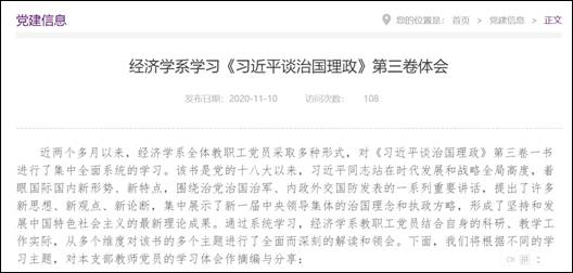 2020年度,经济学系党支部在校党委和学院党委的领导下深入学习《习近平谈治国理政》第三卷、学习贯彻习近平总书记关于研究生教育的重要指示精神,学习贯彻习近平总书记关于依法治国的重要论述,法律法规和保密知识,党的十九届五中全会精神。经过一年的学习研讨,经济学系教工党支部建设工作进一步加强、党内组织工作进一步规范,党员教育工作成为常态。这一年,我们的主要工作如下: