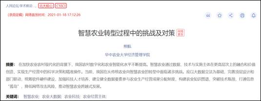 5. 熊航教授服务地方数字乡村建设,积极参与内蒙古鄂托克前旗数字乡村规划。并且,在《人民论坛》上就智慧农业发展问题发表智库成果《智慧农业转型过程中的挑战及对策》。